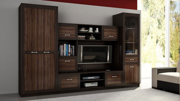 Obývací stěna Boss 4 se skládá ze šatní skříně BS 10, vitríny BS 08, Tv stolku BS 04 a nástavby na TV stolek BS 05.