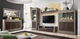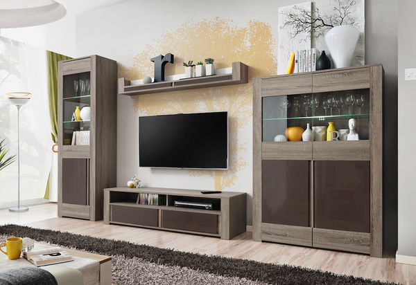 Obývací stěna s efektním LED osvětlením vitrín navodí příjemnou a moderní atmosféru ve Vašem obývacím pokoji. Vysoká vitrína má částečně prosklené dveře a dvě skleněné a dvě klasické poličky. TV stolek se dvěma zásuvkami a dvěma otevřenými prostory na audio/video techniku. Nižší vitrína má také částečně prosklené dveře a podsvícenou skleněnou poličku a dvě klasické poličky. V sestavě se ještě nachází klasická polička na zeď s nosností 10 kg. Úchyty jsou decentně vyfrézovány ve frontech.