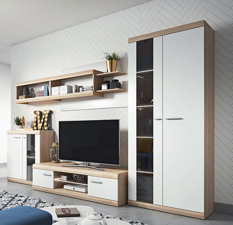 Obývacia stena, ktorá sa skladá z vysokej vitríny, Tv stolíka/skrinky, poličky na stenu a nízkej vitríny. Celá táto zostava je v príjemných svetlých farbách. Led osvetlenie si viete priobjednať sa doplatok.