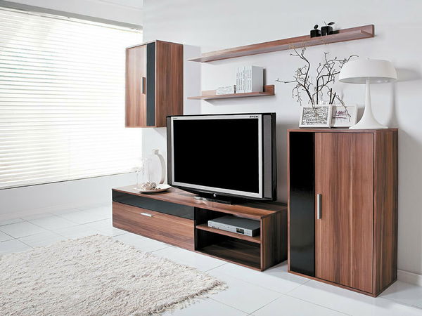 Krásná obývací stěna Barato je velmi oblíbená díky své atraktivní ceně a dobrému provedení, díky použitým materiálům. Barevné provedení obývací stěny je v barvě švestkového dřeva a černé lesklé barvy. Obývací stěna se skládá z poliček, TV stolku, skříňky a visící skříňky.