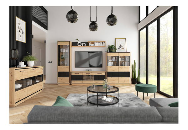 ZobrazitModerní a elegantní. Tak bychom mohli popsat obývací sestavu nábytku z kolekce Pont. Kombinace přírodního dubu artisan a černé s vyfrézovaným povrchem zapadne do moderních domácností. Sestava se skládá z 5 prvků - 1x police, 1x TV stolek se sklem a 3x vitrína. K sestavě lze zakoupit i osvětlení pro skleněné poličky. Zařiďte si obývací pokoj nábytkem Pont a ciťte se pohodlně a odpočatě.