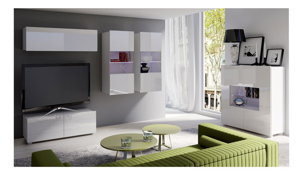 Obývací stěna Calabria C12 (bílý lesk) (bez osvětlení) je skvělou volbou pro zákazníky, kteří hledají moderní a praktický nábytek do obývacího pokoje. Tento set sestává z 5 prvků, které zahrnují 2 závěsné vitríny, 1 poličku, 1 TV stolek RTV 100 a 1 komodu. Závěsné vitríny mají rozměry 45x117x32 cm, polička má rozměry 105x35x32 cm, RTV stolek 100 má rozměry 100x37x43 cm a komoda má rozměry 100x107x35 cm. Osvětlení LED lze zakoupit ve 3 různých barvách - bílé, nebeské modré nebo pomerančové. Výrobek je vyroben z kvalitních materiálů a má ABS hrany, což zaručuje jeho trvanlivost. Tento produkt ovšem neobsahuje osvětlení, ale to si můžete dokoupit samostatně podle svých preferencí a vkusu.