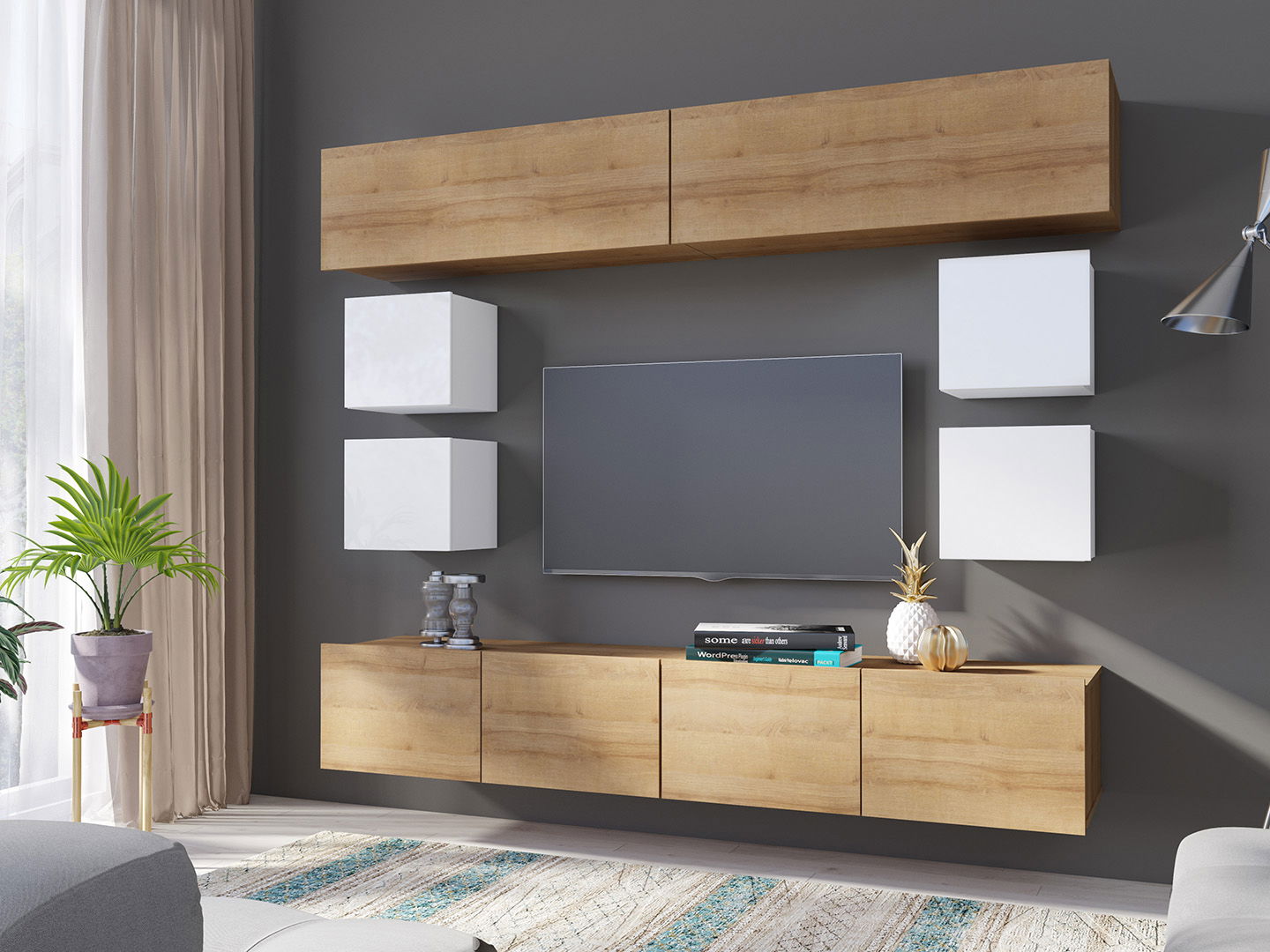 Obývací stěna Calabria C16 (bílý lesk + dub zlatý) (bez osvětlení) je složena z 8 prvků, které jsou ideální pro moderní obývací pokoje Tato stěna obsahuje 2 poličky, 2 Tv stolky RTV 100 a 4 závěsné skříňky KWADRAT. kvalitního materiálu a mají ABS hrany pro větší odolnost. 105x35x32 cm, rozměry RTV stolku 100 jsou 100x37x43 cm a rozměry KWADRAT jsou 34x34x32 cm. Tato obývací stěna je dokonalým doplňkem pro každý obývací pokoj a dokáže ji kouzelně oživit.