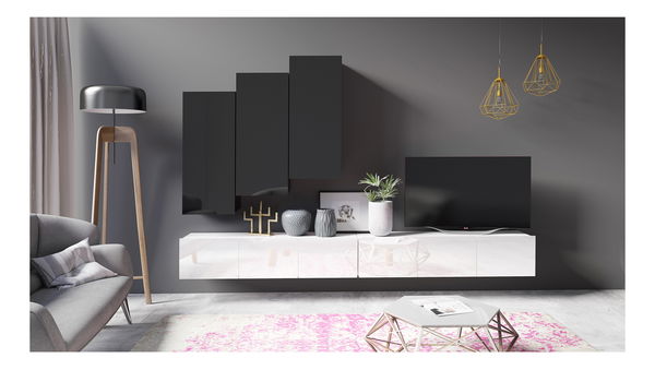 Obývací stěna Calabria C20 (černý lesk + bílý lesk) je ideálním řešením pro ty, kteří hledají moderní a prostorné zařízení pro svůj obývací pokoj. Tato stěna se skládá z 5 prvků: 2x Tv stolek RTV 150 a 3x závěsná skříňka PION, v černém a bílém provedení. Materiál je vyroben z kvalitních materiálů a má ABS hrany. Rozměry RTV stolku 150 jsou 150x37x43 cm a rozměr PION je 45x117x32 cm. Tato obývací stěna bez osvětlení, nenabízí jen úložný prostor, ale také moderní design, který jistě zaujme každého zákazníka.