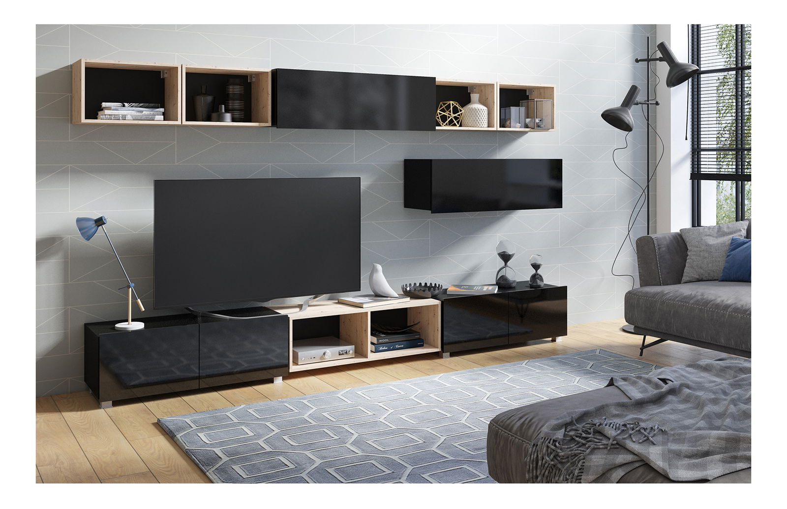 Obývací stěna Calabria C26 BLACK (černá + dub artisan) (bez osvětlení)