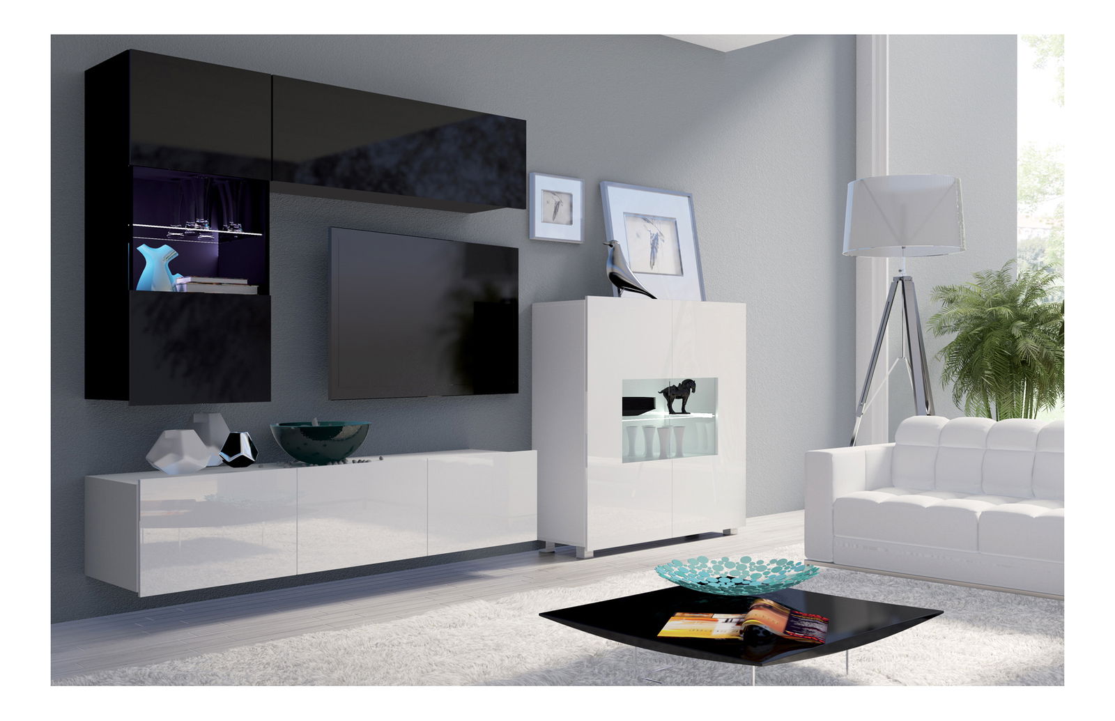 Obývací stěna Calabria C3 (černý lesk + bílý lesk) (bez osvětlení) je ideálním řešením pro váš obývací prostor. Tento set sestává ze 4 prvků: 1x závěsné vitríny, 1x poličky, 1x TV stolku RTV 150 a 1x komody, které vám poskytnou dostatek úložného prostoru. ABS hrany zaručují trvanlivost a kvalitu výrobku. Rozměry závěsné vitríny jsou 45x117x32 cm, rozměry poličky jsou 105x35x32 cm, rozměry RTV stolku 150 jsou 150x37x43 cm a rozměry komody jsou 100x107x35 cm. Osvětlení LED si můžete dokoupit ve třech různých barvách: bílý lesk, nebeská modrá nebo pomerančová, abyste si mohli přizpůsobit svůj interiér podle vašich představ. Tento výrobek je skvělou volbou pro ty, kteří hledají moderní a praktický nábytek pro svůj domov.