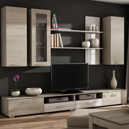 Krásná obývací stěna, která navodí přírodní atmosféru ve Vaší obývacím pokoji. To zejména díky barevnému provedení v barvě dřeva dub sonoma. Modernost dodávají prvky v bílé. Je vyrobena z kvalitní laminované DTD.