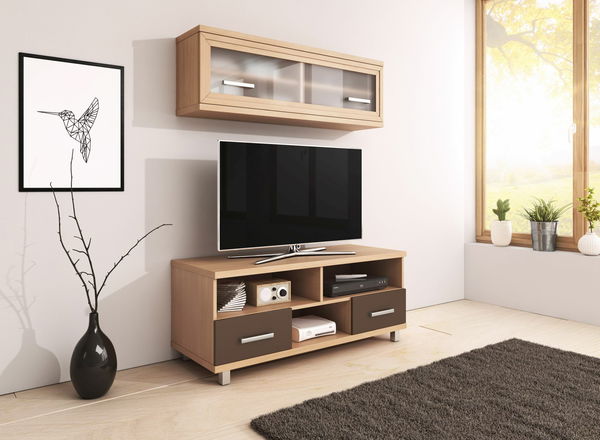 Tato jednoduchá, moderní obývací stěna bude zpestřením vašeho obývacího pokoje. Její součástí je TV stolek a polička. Je to obývací stěna, která je ideální i do menších interiérů. Získat ji můžete v barvě javor nebo javor-amari. Úchyty a nožky jsou zase v příjemném zlatém provedení. Najdete v něm dostatek úložného prostoru na vaše audio / video přehrávače nebo nosiče.