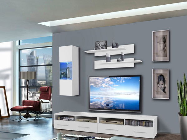 Jednoduchý a moderní design obývací stěny je doplněn o systém push-click, který je využit při vitríně. Obývací stěna je doplněna o LED podsvícení.
