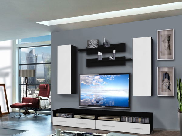 Jednoduchý a moderní design obývací stěny je doplněn o systém push-click, který je využit při skříně na stěnu.
