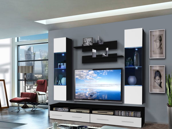 Jednoduchý a moderní design obývací stěny je doplněn o systém push-click, který je využit při vitríně. Obývací stěna je doplněna o LED podsvícení.