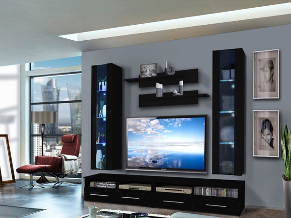 Jednoduchý a moderní design obývací stěny je doplněn o systém push-click, který je využit při vitríně. Obývací stěna je doplněna o LED podsvícení.