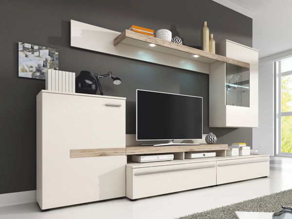 Elegantní obývací stěna s moderními designovými prvky zkrášlí Váš obývací pokoj a naplno využijete i množství úložného prostoru, které poskytuje. Stěna se skládá ze široké skříňky, TV stolku s prostorem pro audio/video zařízení, vitríny na zeď s LED osvětlením a poličkou. V poličce se nachádzjú LED světla, které navodí v obývacím pokoji příjemnou atmosféru.