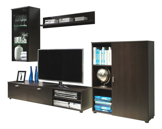 V obývacím pokoji trávíme hodně času, a proto se ji snažíme, co nejútulnější zařídit. Obývací stěna je dobrým řešením, jak vnést do obývacího pokoje styl a praktické řešení úložného prostoru. Tato obývací stěna se skládá ze čtyř segmentů - z TV stolku se dvěma dvířky a dvěma otevřenými poličkami pro audio / video zařízení, z elegantní vitríny, ve které vyniknou Vaše dekorace, šikovné poličky, kam si můžete poskládat oblíbené fotografie a doplňky a nízkého regálu, který můžete velmi jednoduše přetvořit na knihovnu.