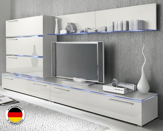 Moderní obývací stěna Dortmund je vyrobena z těch nejkvalitnějších materiálů. Všechny komponenty tohoto nábytku jsou vyrobeny v Německu. Korpus je matné bílé barvy, přičemž dvířka jsou ve vysokém lesku. K proskleným částem si lze přiobjednat efektní RGB osvětlení, při kterém máte možnost vybrat si až z devíti různých barev podsvícení. Díky tomu si můžete podle nálady měnit atmosféru místnosti.