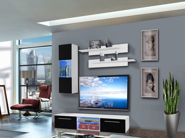 Jednoduchý a moderní design obývací stěny je doplněn o systém push-click, který je využit při vitríně. Obývací stěna je doplněna o LED podsvícení.