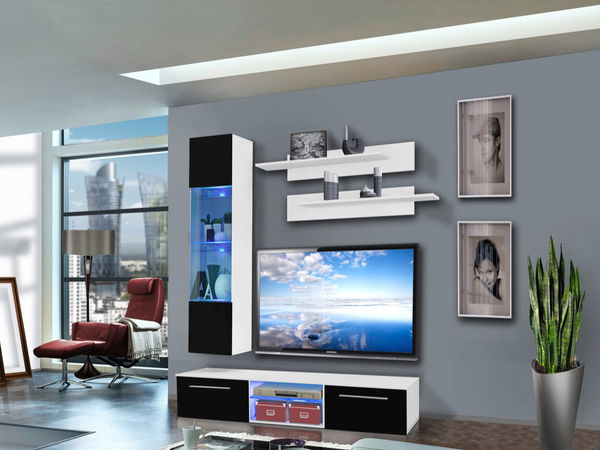 Jednoduchý a moderní design obývací stěny je doplněn o systém push-click, který je využit při vitríně. Obývací stěna je doplněna o LED podsvícení.