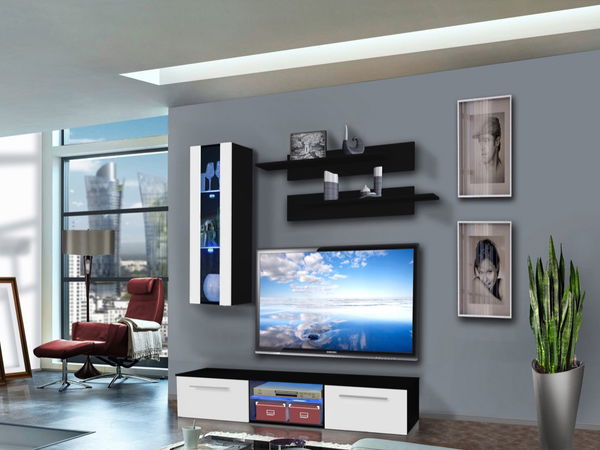 Jednoduchý a moderní design obývací stěny je doplněn o systém push-click, který je využit při vitríně. Obývací stěna je doplněna o LED podsvícení.