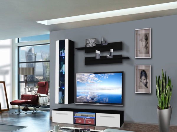 Jednoduchý a moderní design obývací stěny je doplněn o systém push-click, který je využit při vitríně. Obývací stěna je doplněna o LED podsvícení.