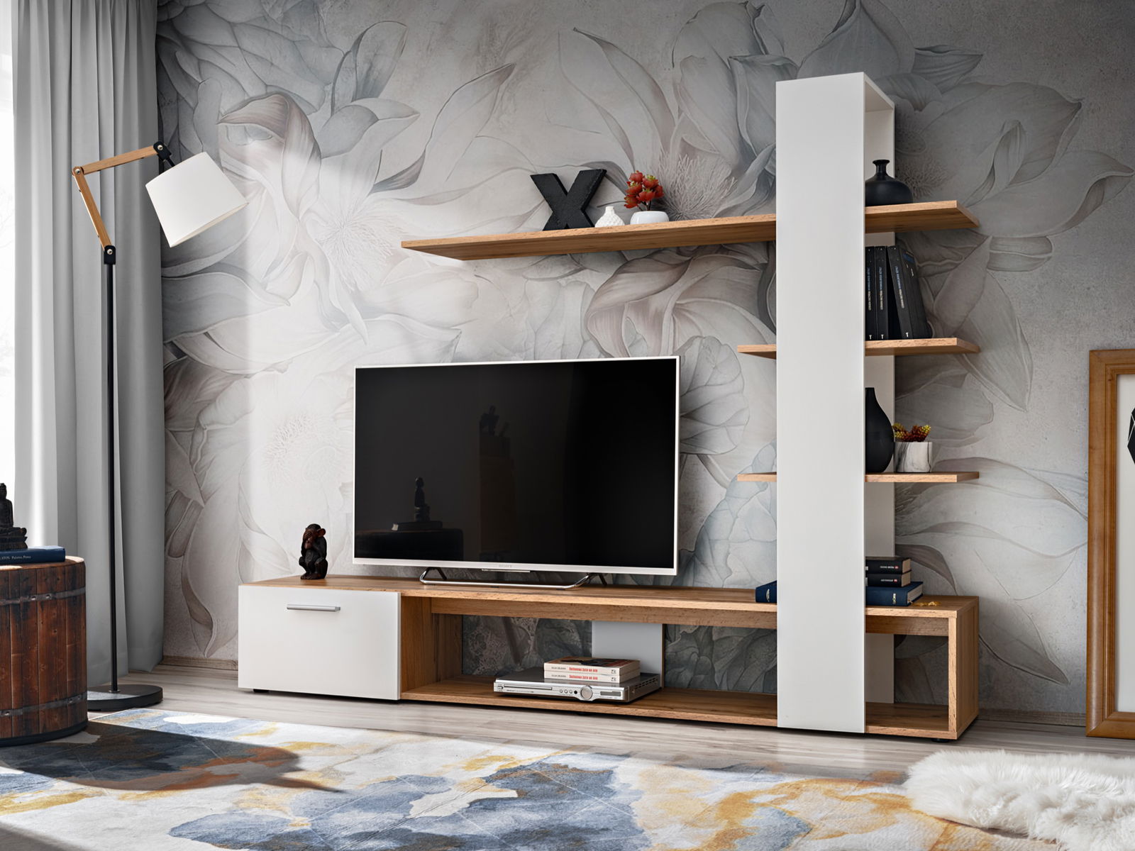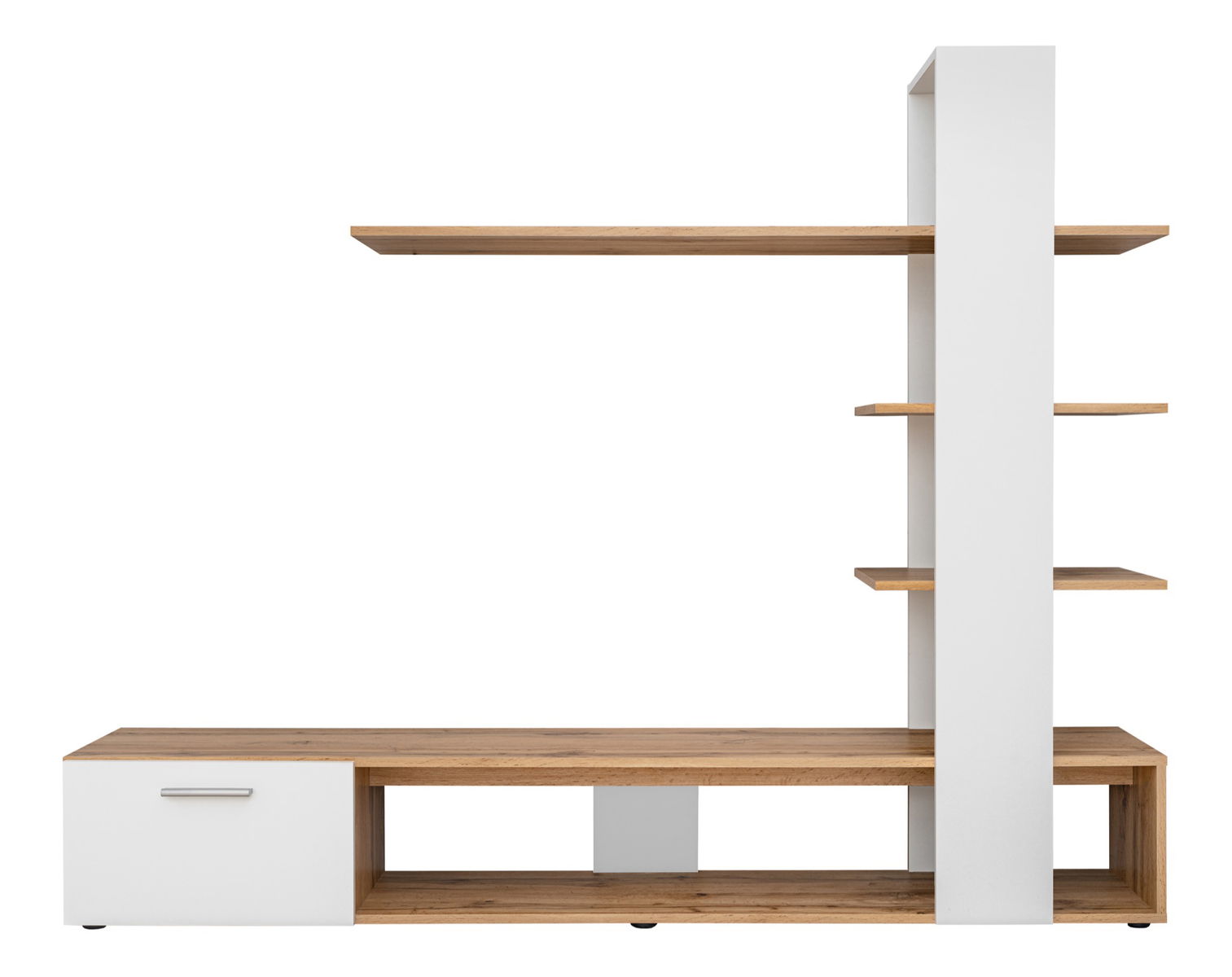 ZobrazitObývací stěna Rinse moderního charakteru je designována pro poskytnutí co největšího úložného prostoru. RTV: sestává ze tří samostatných nástěnných skříněk. Dole na levé straně se nachází černá kovová noha. Závěsná police obsahuje dekorativní kovový prvek. Nástěnná vitrína je částečně prosklená orámovaná černým hliníkovým rámem. Za dvířky se nachází jedna police a dvě skleněné police osvětlené bílým LED osvětlením. Pod RTV stolkem se nachází skříňka s jedním místem uvnitř. Systém otevírání push-click.