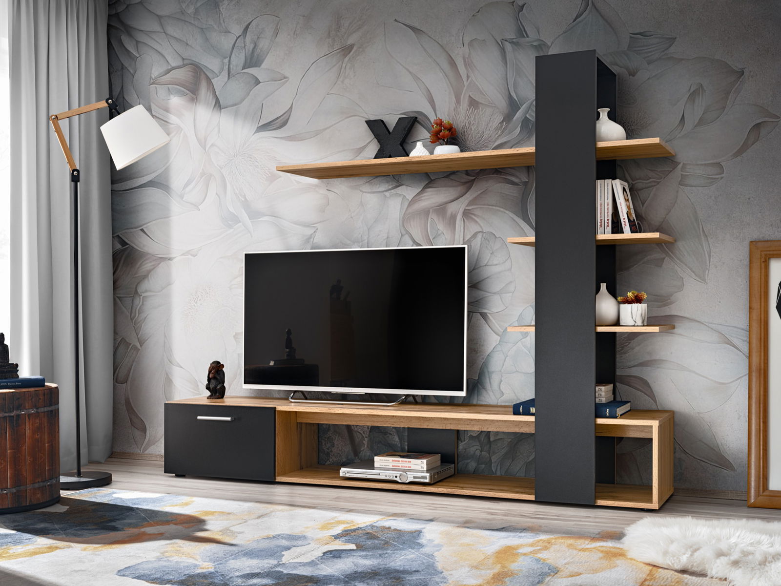 ZobrazitObývací stěna Rinse moderního charakteru je designována pro poskytnutí co největšího úložného prostoru. RTV: sestává ze tří samostatných nástěnných skříněk. Dole na levé straně se nachází černá kovová noha. Závěsná police obsahuje dekorativní kovový prvek. Nástěnná vitrína je částečně prosklená orámovaná černým hliníkovým rámem. Za dvířky se nachází jedna police a dvě skleněné police osvětlené bílým LED osvětlením. Pod RTV stolkem se nachází skříňka s jedním místem uvnitř. Systém otevírání push-click.