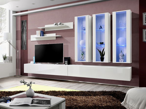 Obývací stěna Ferryhill 23 WW FY E3 Černá matná + Bílý lesk je moderní nábytek v elegantním designu, který se hodí do každého interiéru. Systém push-click umožňuje snadné otevírání dveří. Stěna obsahuje TV stolek/skříňku, vitrínu a poličkový systém. LED podsvícení přidává ke stěně stylový efekt. Rozměry stěny jsou: TV stolek/skříňka - 30 x 160 x 40 cm, vitrína - 126 x 40 x 29 cm, poličkový systém - 60 x 120 x 20 cm. Stěna je dodávána v 6 balících o celkové váze 143 kg. S touto stěnou získáte kvalitní a moderní nábytek, který zkrášlí váš obývací prostor.