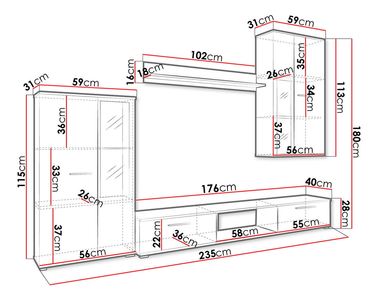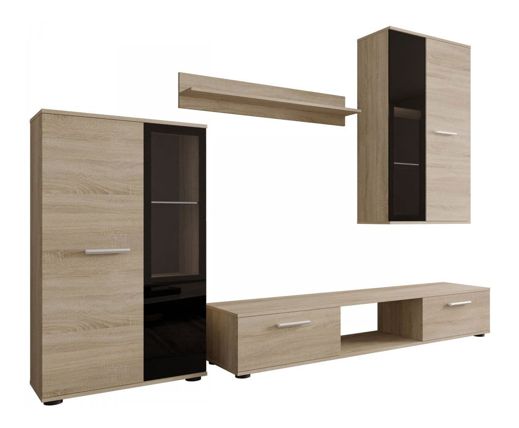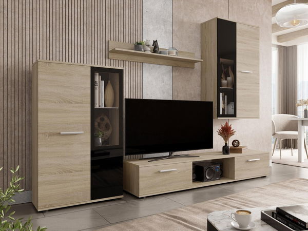 Obývací stěna Fiesta je klasickým příkladem moderní sestavy nábytku. Stěna je vyrobena z laminované desky se strukturou dřeva, která vypadá úžasně v menších místnostech. Jednotlivé elementy ze sestavy lze umístit samostatně přesně tak, aby se stěna přizpůsobila Vaší místnosti a stala se funkční. Skleněné části dodávají kouzlo a oživují celkový vzhled stěny. LED osvětlení lze dokoupit za příplatek.