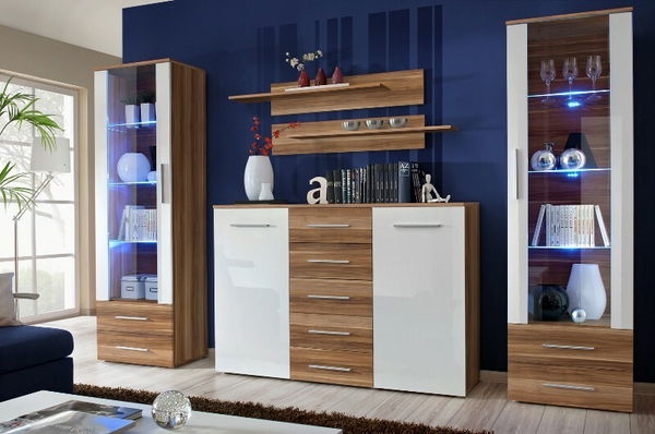 Obývací stěna Galina D má kromě dvou vitrín a dvou poliček v sestavě ještě prostornou komodu. Po bocích má dvířka s úložným prostorem a policemi. Ve středu se nachází pět zásuvek. Vysoká vitrína má zčásti prosklené dveře a v dolní části dvě zásuvky. Obsahuje tři skleněné, LED osvětlením podsvícené poličky. Samostatné poličky na stěnu nabízejí další odkládací prostor na maličkosti. Prosklené části jsou vyrobeny z čirého tvrzeného skla.