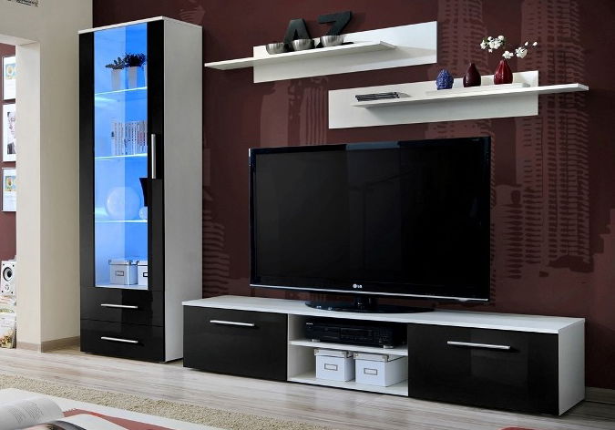 ZobrazitObývací stěna Gorefield 23 WSH GA (s osvětlením) v bílém a lesk černém provedení je skvělým řešením pro menší obývací pokoje. Svojí jednoduchostí a elegantním designem se skvěle hodí do každého interiéru. TV skříňka má dvě dvířka s 25 cm dlouhými úchytkami a střední otevřený prostor pro umístění audio/video příslušenství. Vysoká vitrína má zčásti prosklené dveře a dvě zásuvky v dolní části a obsahuje tři skleněné poličky se LED osvětlením. Samostatné poličky na zeď nabízí další úložný prostor. Vitrína také nabízí univerzální dvířka s možností montáže na obou stranách a možností volby levého nebo pravého otevírání. Celková výška stěny je 190 cm a hloubka 45 cm. V balení jsou 4 prvky a 6 balíků o rozměrech uvedených níže.