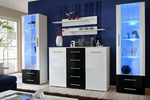 Obývací stěna Galina D má kromě dvou vitrín a dvou poliček v sestavě ještě prostornou komodu. Po bocích má dvířka s úložným prostorem a policemi. Ve středu se nachází pět zásuvek. Vysoká vitrína má zčásti prosklené dveře a v dolní části dvě zásuvky. Obsahuje tři skleněné, LED osvětlením podsvícené poličky. Samostatné poličky na stěnu nabízejí další odkládací prostor na maličkosti. Prosklené části jsou vyrobeny z čirého tvrzeného skla.