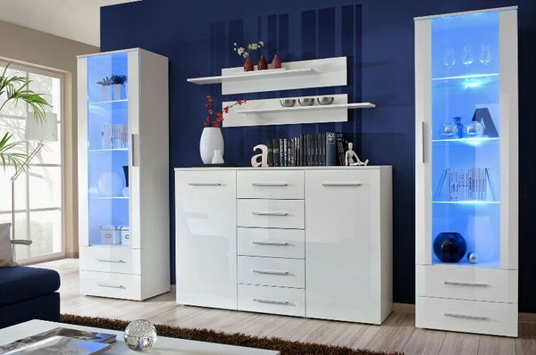Obývací stěna Galina D má kromě dvou vitrín a dvou poliček v sestavě ještě prostornou komodu. Po bocích má dvířka s úložným prostorem a policemi. Ve středu se nachází pět zásuvek. Vysoká vitrína má zčásti prosklené dveře a v dolní části dvě zásuvky. Obsahuje tři skleněné, LED osvětlením podsvícené poličky. Samostatné poličky na stěnu nabízejí další odkládací prostor na maličkosti. Prosklené části jsou vyrobeny z čirého tvrzeného skla.