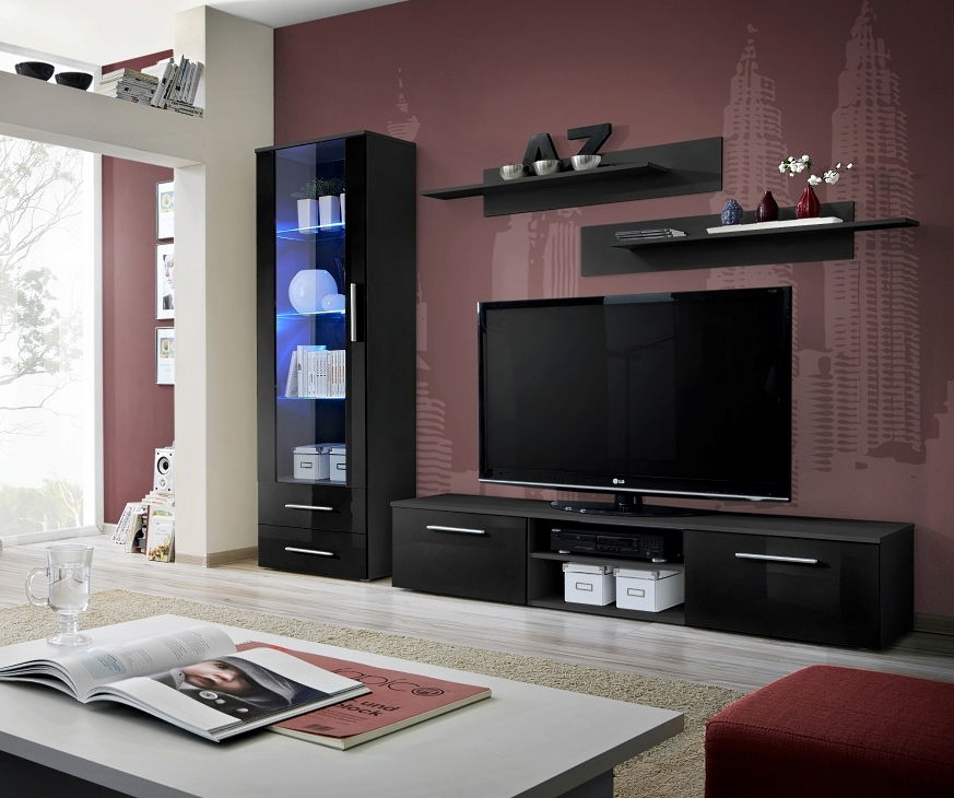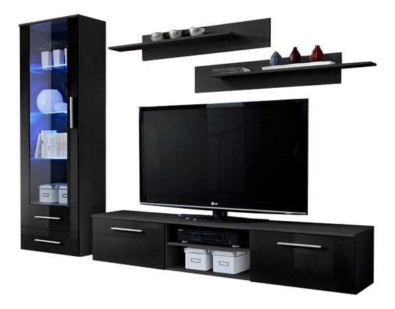ZobrazitObývací stěna Gorefield 24 ZZ GA (s osvětlením) v černém a lesklém černém provedení o výšce 190 cm a hloubce 45 cm je složena ze čtyř prvků a ideální do menších prostor. TV skříňka má dvoje elegantní dvířka s 25 cm dlouhými úchytkami a ve středu otevřený prostor pro audio/video příslušenství. Vysoká vitrína nabízí zčásti prosklené dveře a dvě zásuvky v dolní části. Obsahuje tři skleněné, LED osvětlením podsvícené poličky a samostatné poličky pro odkládání maličkostí. Prosklené části jsou vyrobeny z čirého tvrzeného skla. Rozměry jsou: TV stolek/skříňka: 37 x 180 x 45 cm, vitrína: 190 x 60 x 40 cm, polička: 20 x 100-120 x 20 cm. Balíky mají následující rozměry v (š. x v. x h.): čj. 1 - 112x23x9 cm/9 kg. 2 - 189x48x12 cm/30 kg. 3 - 67x35x3 cm/4 kg. 4 - 198x65x9 cm/37 kg. 5 - 156x65x3 cm/12 kg. 6 - 68x21x5 cm/3 kg. 7 - 112x23x90 cm.