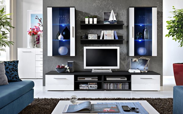 Obývací stěna Galino G zaujme moderním designem a jednoduchostí. Dvě TV skříňky, dvě vitríny a dvě poličky, to je to, co Vám tato obývací stěna nabízí. TV skříňka má jednu část uzavřenou dvířky a druhou otevřenou, pro umístění audio a video příslušenství. Vitríny mají prosklená dvířka a dvě skleněné poličky, které jsou efektně podsvíceny LED osvětlením. Dvě samostatné poličky na zeď už jen dotvářejí celkovou sestavu. Skleněné části jsou vyrobeny z tvrzeného skla. Všechny fronty jsou lesku.
