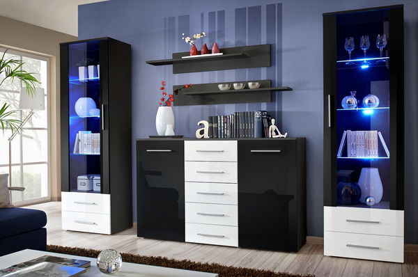 Obývací stěna Galino D má kromě dvou vitrín a dvou poliček v sestavě ještě prostornou komodu. Po bocích má dvířka s úložným prostorem a policemi. Ve středu se nachází pět zásuvek. Vysoká vitrína má zčásti prosklené dveře a v dolní části dvě zásuvky. Obsahuje tři skleněné, LED osvětlením podsvícené poličky. Samostatné poličky na stěnu nabízejí další odkládací prostor na maličkosti. Prosklené části jsou vyrobeny z čirého tvrzeného skla. Všechny fronty jsou v lesku.