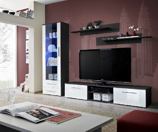 Obývací stěna Galino A je složena ze čtyř prvků a je vhodná do menších prostorů. Svým designem a jednoduchostí však skvěle zapadne do interiéru obývacího pokoje. TV skříňka má dvoje dvířka, na kterých jsou elegantní, 25 cm dlouhé úchyty. Ve střední části je otevřený prostor pro uložení audio/video příslušenství. Vysoká vitrína má zčásti prosklené dveře a v dolní části dvě zásuvky. Obsahuje tři skleněné, LED osvětlením podsvícené poličky. Samostatné poličky na stěnu nabízejí další odkládací prostor na maličkosti. Prosklené části jsou vyrobeny z čirého tvrzeného skla. Všechny fronty jsou v lesku.