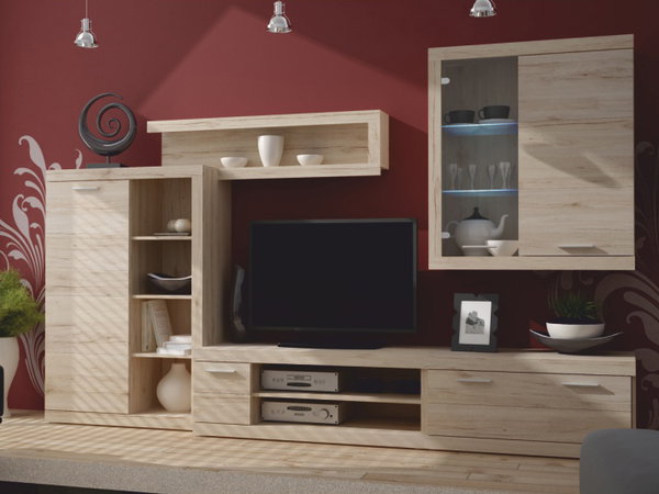 Obývací stěna spojující přírodní rysy s příjemným moderním designem. Jednotlivé prvky obývací stěny mají výraznější rysy, důraz se však klade i na neobyčejný design a praktičnost. Obývací stěna se skládá z TV stolku, skříňky, police a vitríny na stěnu, která má podsvícené poličky. Obývací stěna je v barevném provedení san remo.