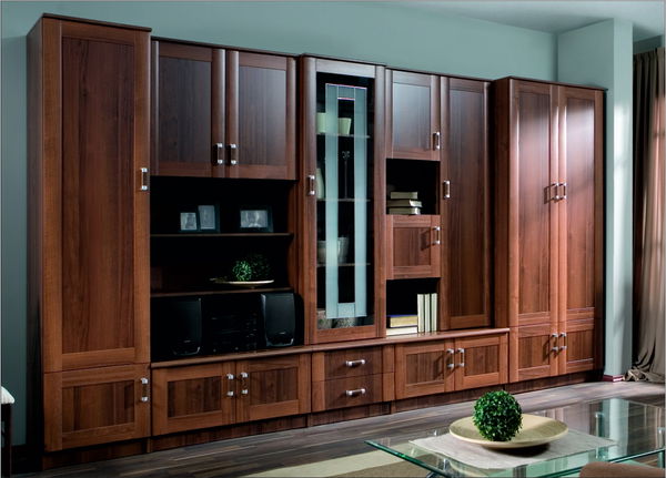 Velká obývací stěna rustikálního charakteru nabízí množství úložného prostoru. Je vhodná zejména do klasicky zařízeného obývacího pokoje.