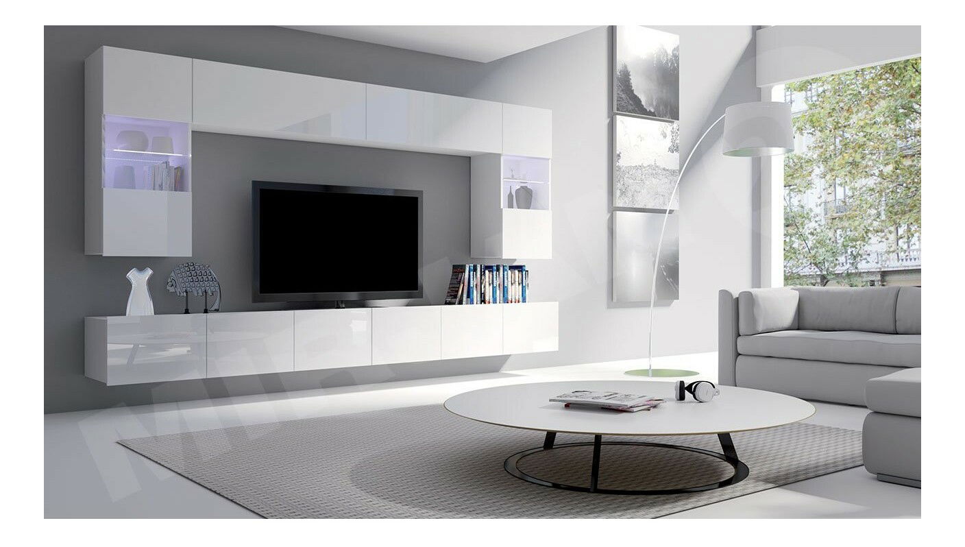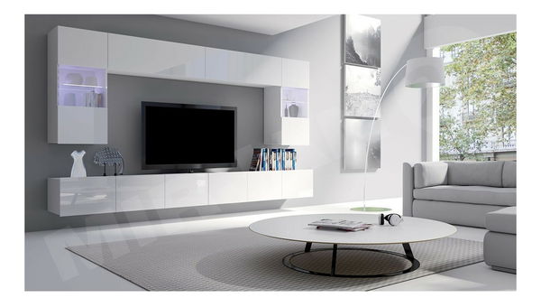 ZobrazitObývací stěna se skládá až ze 6 elementů, jako jsou 2 TV skříňky, 2 závěsné vitríny a 2 závěsné police. Dvířka obývací stěny jsou vyrobena ve vysokém lesku v klasických barevných provedeních bílá a černá. Skříňky nemají úchytky. Další možností je LED osvětlení, které krásně osvětlí interiér místnosti. TV skříňku lze připevnit jako závěsnou skříňku a po namontování nožiček ji můžete použít jako stojící skříňku. Všechny elementy lze umístit tak, jak Vám to vyhovuje. Obývací stěna je vyrobena ve vysoké kvalitě elementů a materiálů.