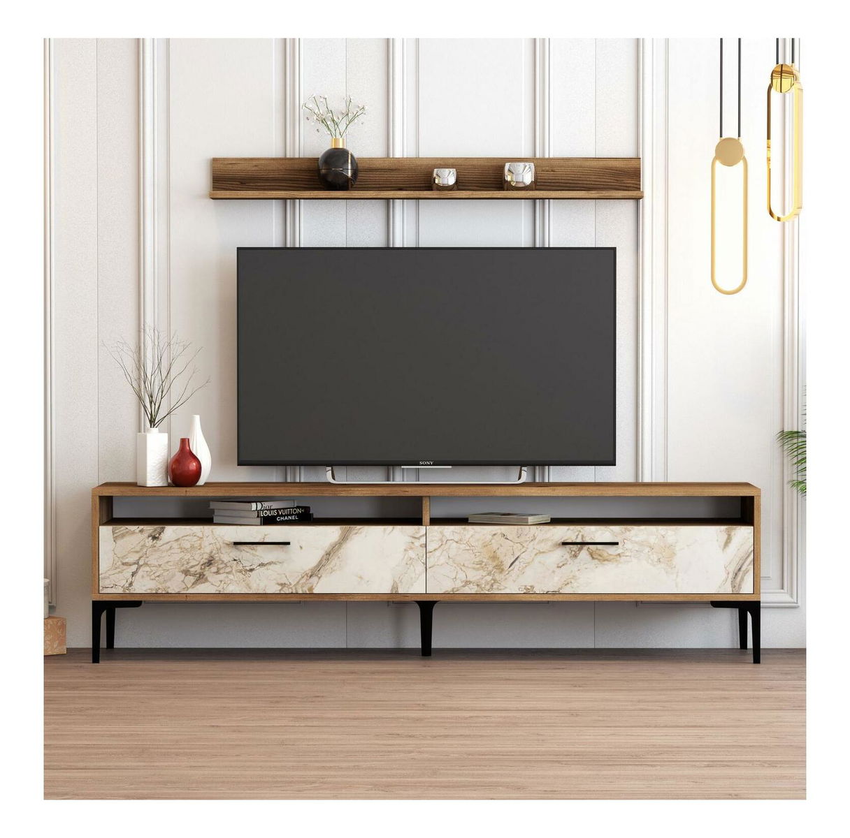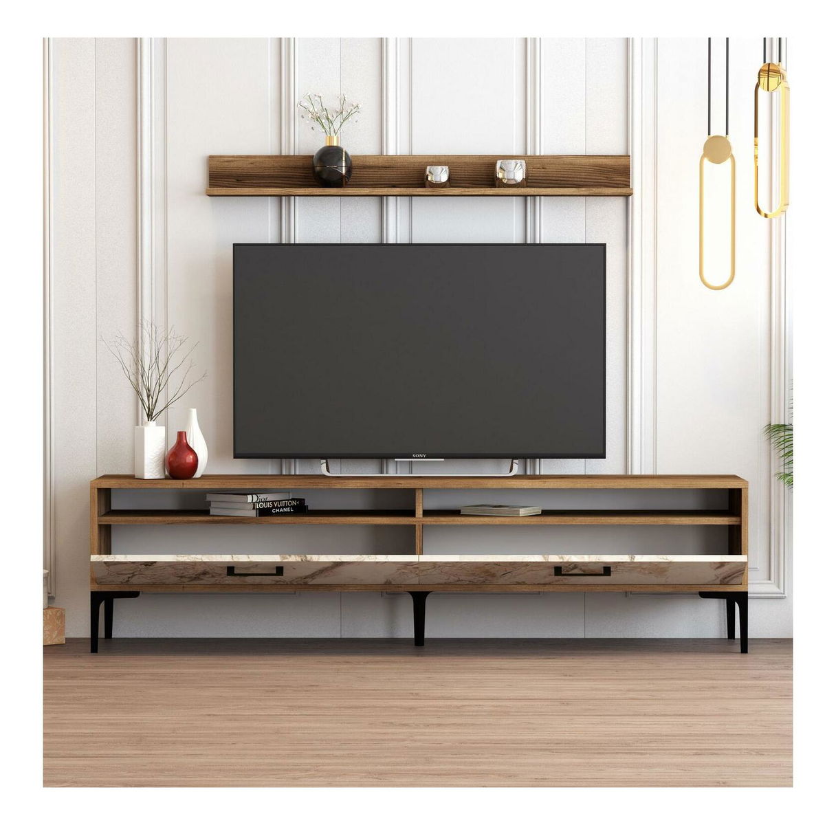 tloušťka: 18 mm, TV stojan: šířka: 180 cm, výška: 47 cm, hloubka: 35 cm, nástěnná police velikost: šířka: 120 cm, výška: 11,8 cm, hloubka: 16 cm, kovové nohy,: 17 cm