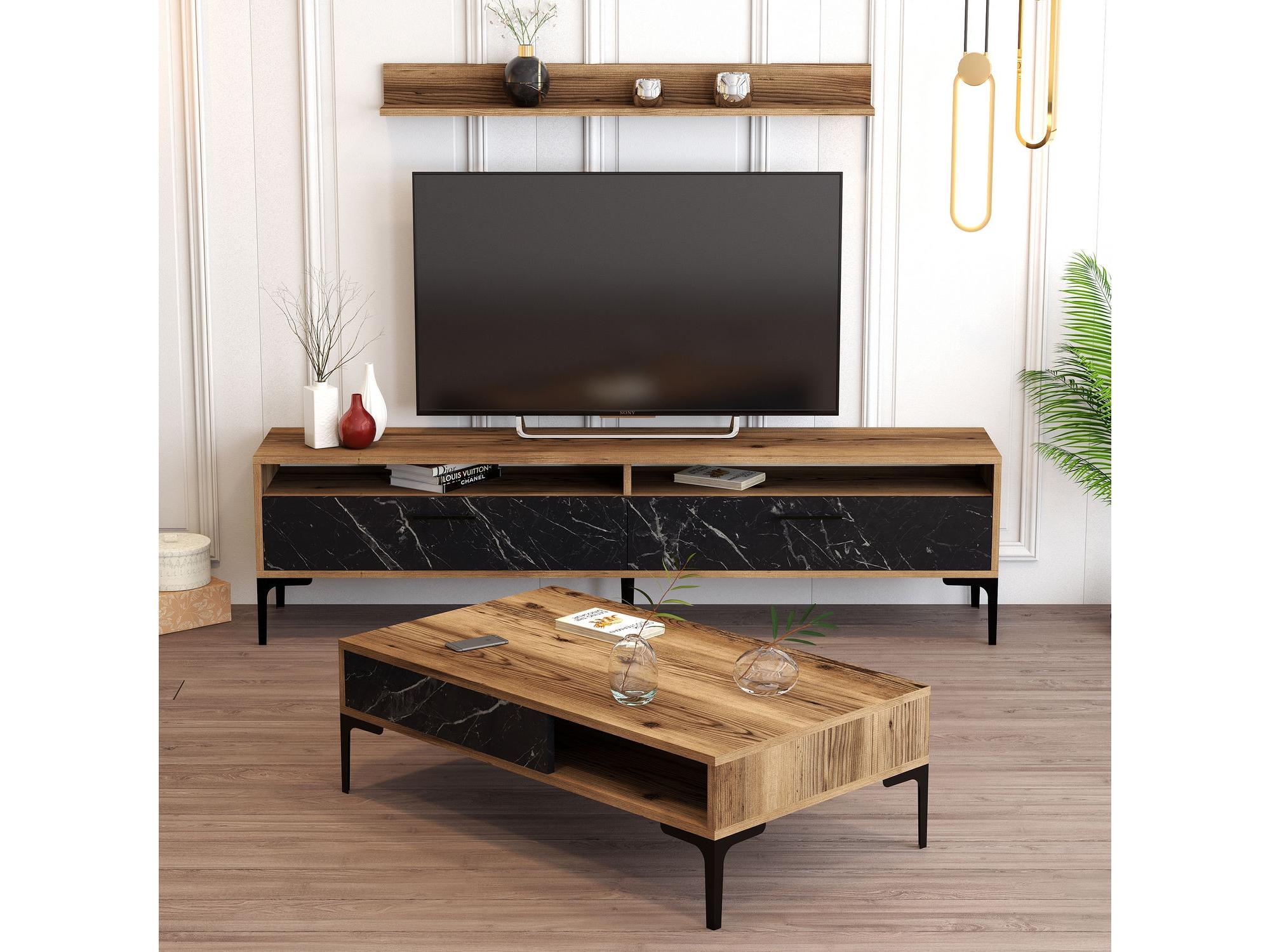 tloušťka: 18 mm, stojan na TV: šířka: 180 cm, výška: 47 cm, hloubka: 35 cm, velikost nástěnné police: šířka: 120 cm, výška: 11,8 cm, hloubka: 16 cm, konferenční stolek: šířka: 105 cm, výška: 32,6 cm, hloubka: 60 cm, kovové nohy,: 17 cm