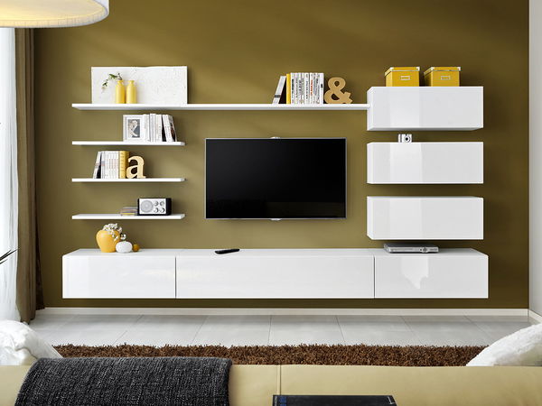 Moderní obývací stěna s jednoduchými liniemi a velkou praktickou stránkou. Sestava obsahuje skříňky s výklopnými dvířky a poličky. Protože nejsou na sebe vázány, můžete si je umístit buď podle vzoru na obrázku, nebo zapojit fantazii a zařídit si obývací pokoj dle vlastních představ a potřeb. Všechna dvířka se otevírají důmyslným PUSH-CLICK systémem, kdy stačí jemně zatlačit pro otevření nebo opětovné zavření dvířek. Fronty mají vysoký PCV lesk.