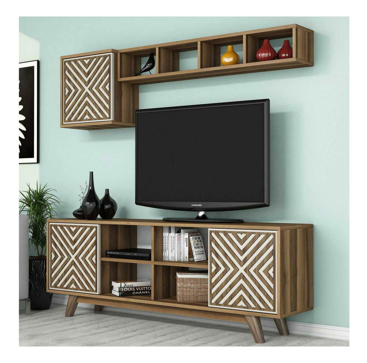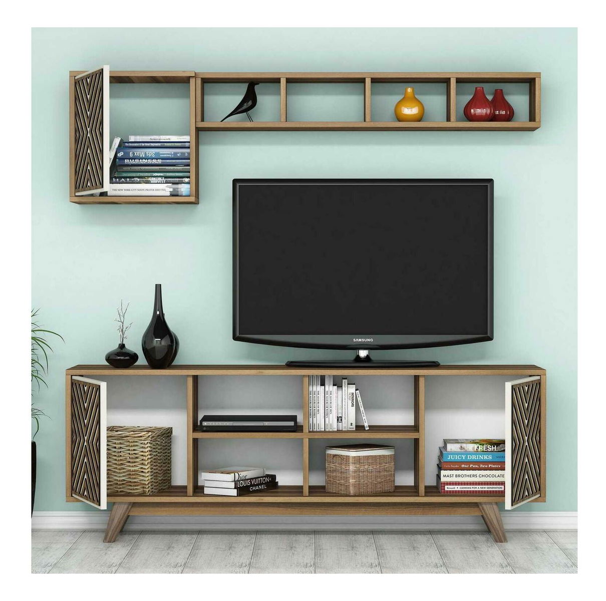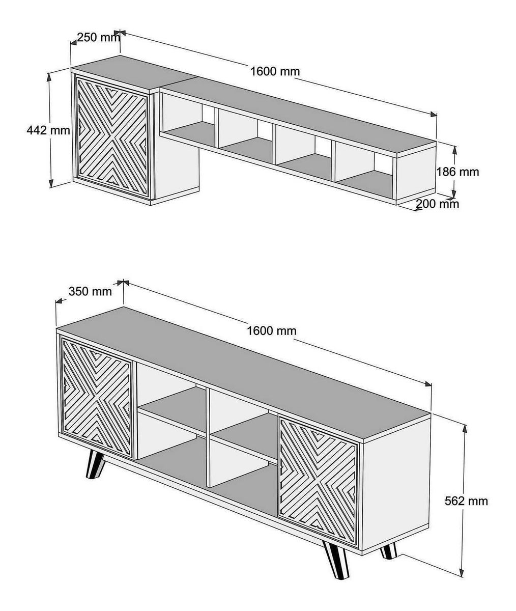 tloušťka: 18 mm, velikost TV jednotky: šířka: 160 cm, výška: 56,2 cm, hloubka: 35 cm, velikost nástěnné police: šířka: 117,6 cm, výška: 18,6 cm, hloubka: 20 cm, velikost skříňky: šířka: 42,4 cm, výška: 42,4 cm, hloubka: 25 cm