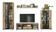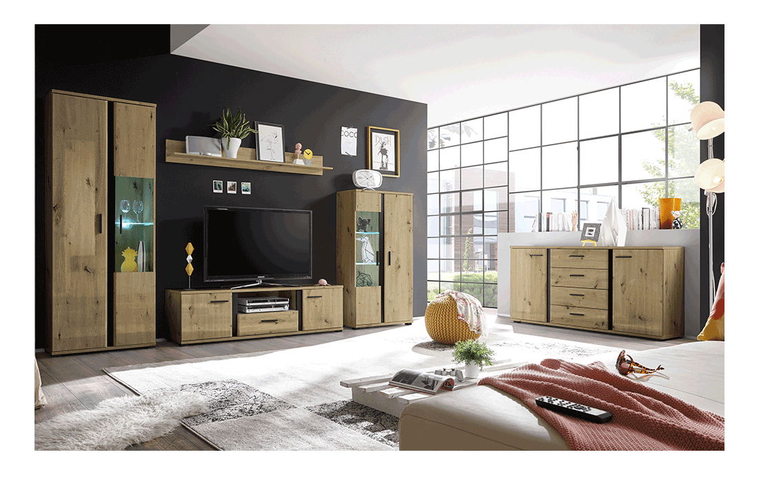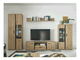 Sestava obsahuje polici, vitrínu, vysokou vitrínu a TV stolek