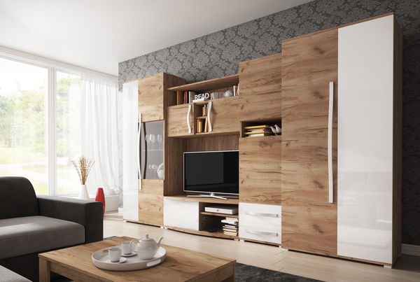 Obývací stěna Lavender o výšce 202 cm a hloubce 52 cm je ideálním doplňkem vašeho obývacího prostoru. Tato stěna v Dub craft zlatý a Lesk bílý barvě se skládá z více částí, které dokonale spolupracují. Vitrína o rozměrech 202 x 80 x 45 cm nabízí dostatek místa pro uskladnění různých předmětů, zatímco TV stolek o velikosti 42 x 110 x 52 cm umožňuje pohodlné umístění televizoru. Nástavba o rozměrech 141 x 110 x 37 cm a policová skříň o výšce 192 cm, šířce 50 cm a hloubce 45 cm poskytují další úložný prostor. Šatní skříň o velikosti 202 x 80 x 52 cm slouží k uskladnění oděvů a doplňků. Obývací stěna Lavender je vyrobena z kvalitních materiálů a její design dodá vašemu obývacímu prostoru stylový a moderní vzhled.