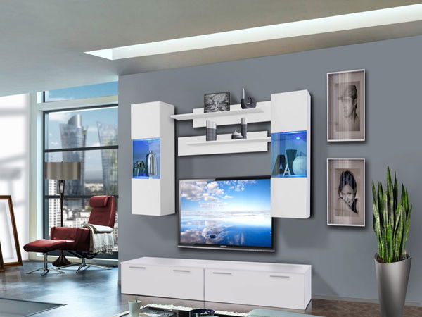 Jednoduchý a moderní design obývací stěny je doplněn o systém push-click, který je využit při vitríně. Obývací stěna je doplněna o LED podsvícení.