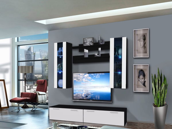 Jednoduchý a moderní design obývací stěny je doplněn o systém push-click, který je využit při vitríně. Obývací stěna je doplněna o LED podsvícení.