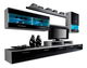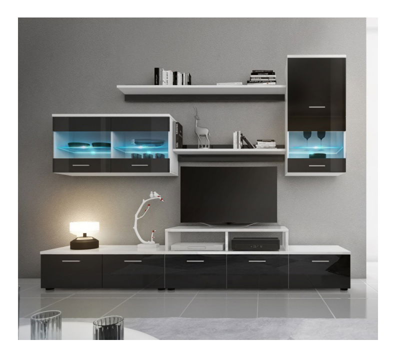 ZobrazitNádherná obývací stěna luxusního charakteru s přitažlivým modrým LED osvětlením ve dvou vitrínách na stěně. Stavební materiál je DTD laminovaná s ABS hranami, čímž se dosáhne maximální odolnost a trvanlivost obývací stěny po po dlouhá léta používání. Stěna je vybavena tenkými vodorovnými šedými úchyty. Provedení je extra vysoký černý lesk HG, korpus je bílý. Stěna se skládá z dvoudveřové široké vitríny na zeď s prosklenými dvířky a skleněnými policemi (čiré sklo), dále z 2 polic na stěnu, jedné dlouhé a jedné kratší. Na pravé straně stěny se nachází úzká vitrína na stěnu s prosklenými dvířky a skleněnými policemi (čiré sklo) a na spodku je umístěn rozměrný dlouhý TV stolek s pěti úložnými prostory. Pod TV stolkem jsou umístěny 2 police v bílé barvě uloženy vedle sebe určené pro audio/video zařízení.