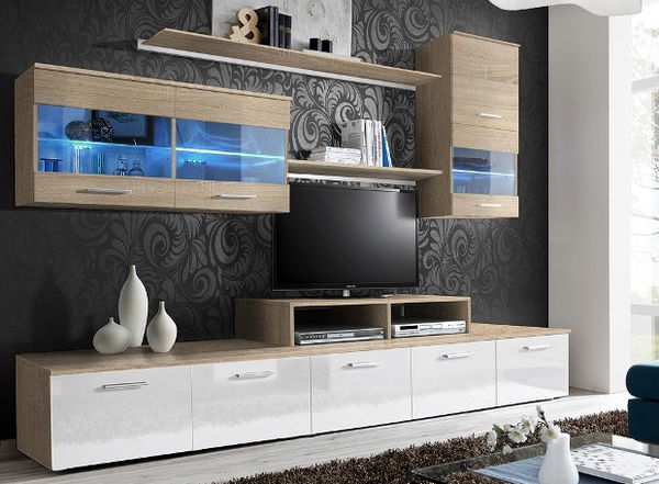 Obývací stěna Logo II svým nápaditým designem dodá Vašemu obývacímu pokoji moderní styl. TV stolek je složen ze dvou větších skříněk, jedné malé a nástavby. Levá vitrína má částečně prosklená dvířka za kterými se nachází skleněná polička. Pravá vitrína má horní dvířka plné, za kterými je úložný prostor s poličkou a dolní částečně prosklené se skleněnou poličkou. Prostor vitrín je podsvícen efektním LED osvětlením. Skleněné části jsou vyrobeny z tvrzeného skla. Jednoduché poličky na stěnu mají nosnost 10 kg. Obývací stěna je vyráběna ve více barevných provedeních. Díky tomu si vyberete tu správnou pro Váš interiér.