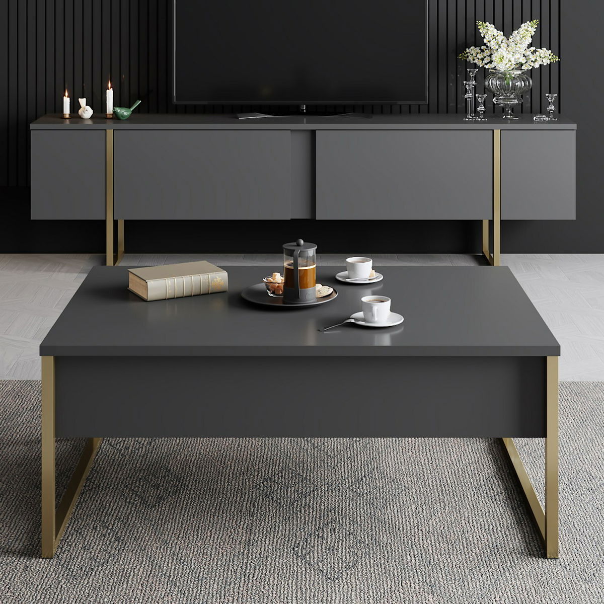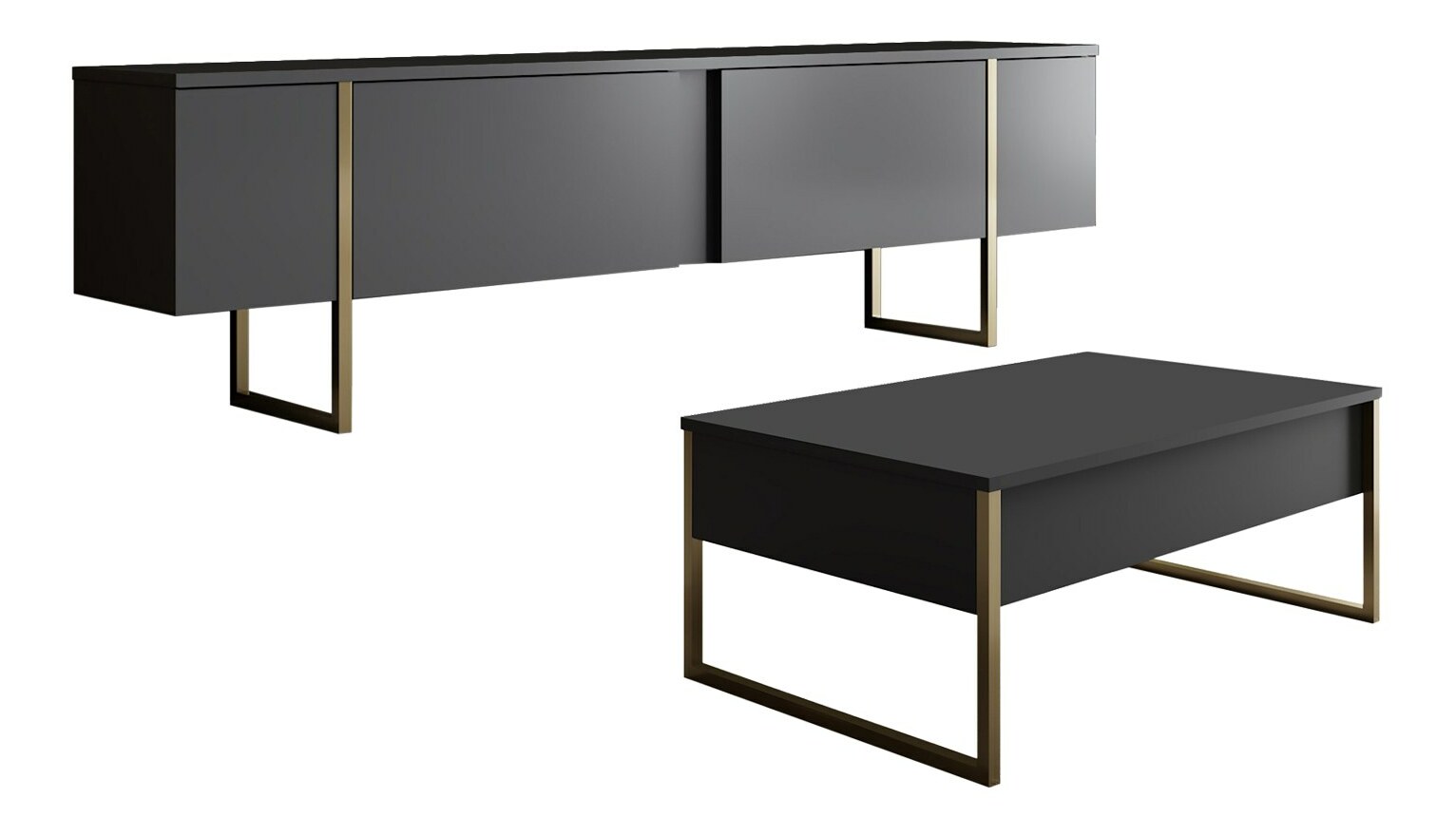 Obývací stěna - Luna (Antracit + Zlatá) je elegantní a funkční kus nábytku, který vám poskytne dostatek úložného prostoru a zároveň přidá styl vašemu obývacímu prostoru. S výškou 47 cm a šířkou 180 cm, tato stěna je dostatečně velká pro uložení vašich knih, vystavení dekorací nebo přenášení televizoru. S hloubkou 30 cm je dostatečně prostorově úsporná. Kombinace antracitové a zlaté barvy vytváří moderní a sofistikovaný vzhled, který se hodí do jakéhokoli interiéru. Obývací stěna - Luna je vyrobena z kvalitních materiálů, které zajišťují její trvanlivost a odolnost. Nechte tuto zeď vylepšit váš domov a přidat do něj eleganci a praktičnost.