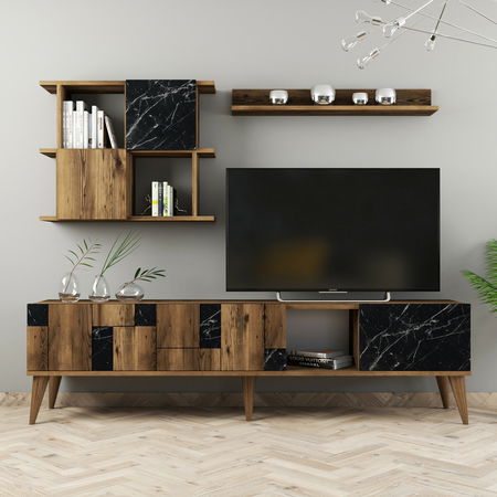 ZobrazitObývací stěna - Madryt (Ořech + Černá) je elegantní nábytek pro váš obývací prostor. S výškou 48 cm, šířkou 180 cm a hloubkou 33 cm, tato stěna nabízí dostatek úložného prostoru pro vaše věci. Je vyrobena z kvalitního dřeva v odstínech ořechu a černou barvu, což dodává vašemu interiéru moderní a stylový vzhled. Stěna je prakticky rozdělena na více částí, včetně skříněk, policek a prostoru pro televizi, takže můžete snadno uspořádat své věci a elektroniku. S tímto kusem nábytku získáte nejen funkčnost, ale také designový prvek, který zpříjemní váš domovský prostředí.